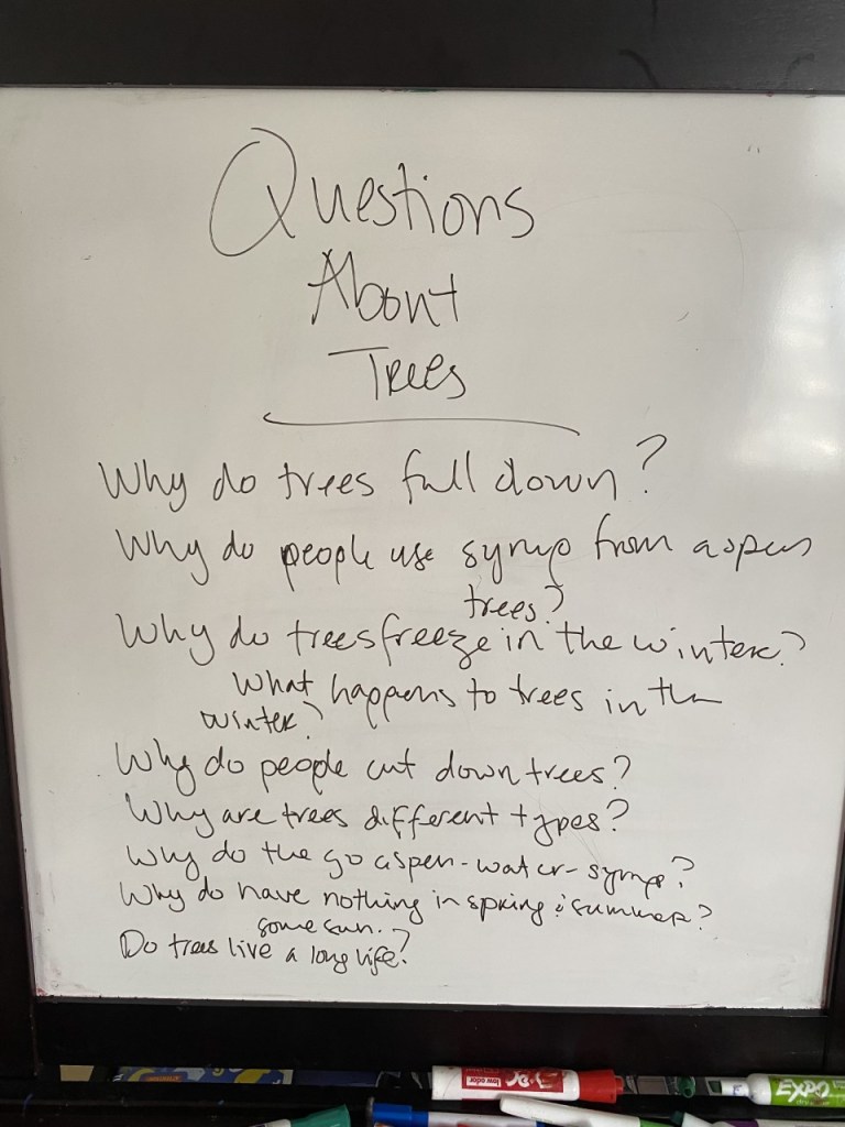 Pictured below our students did some brainstorming about trees (ideas they had and things they “knew”) and asked questions about trees!